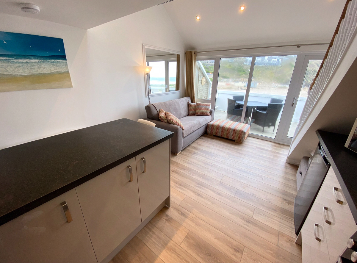 The open plan living space has floor to ceiling patio windows onto the large balcony with table and chairs, and directly overlooks the sea so plenty of people and surfer watching opportunities!